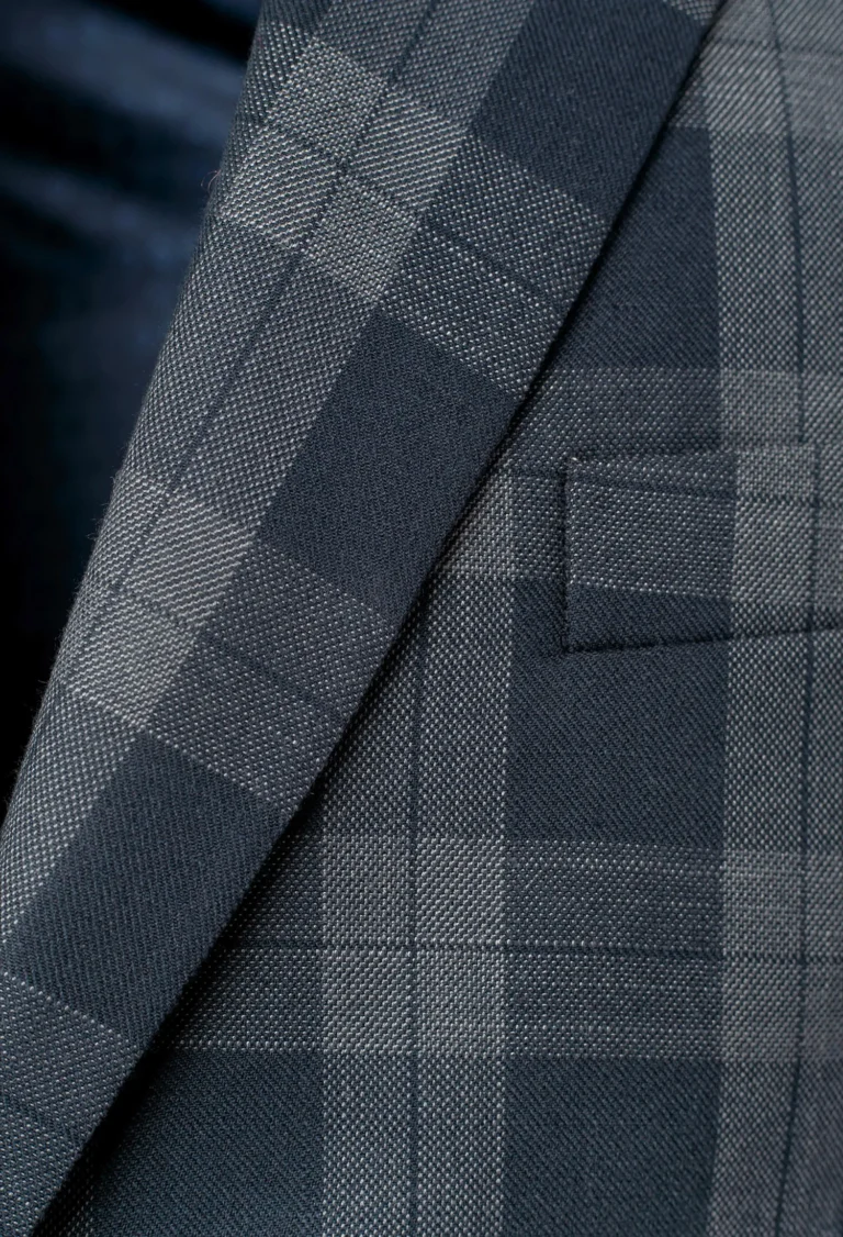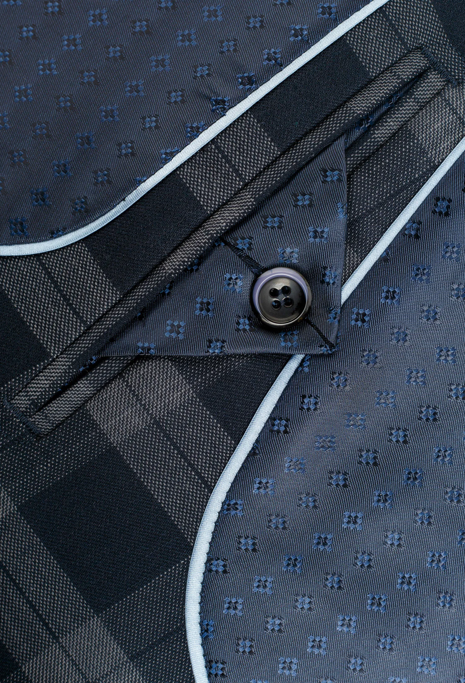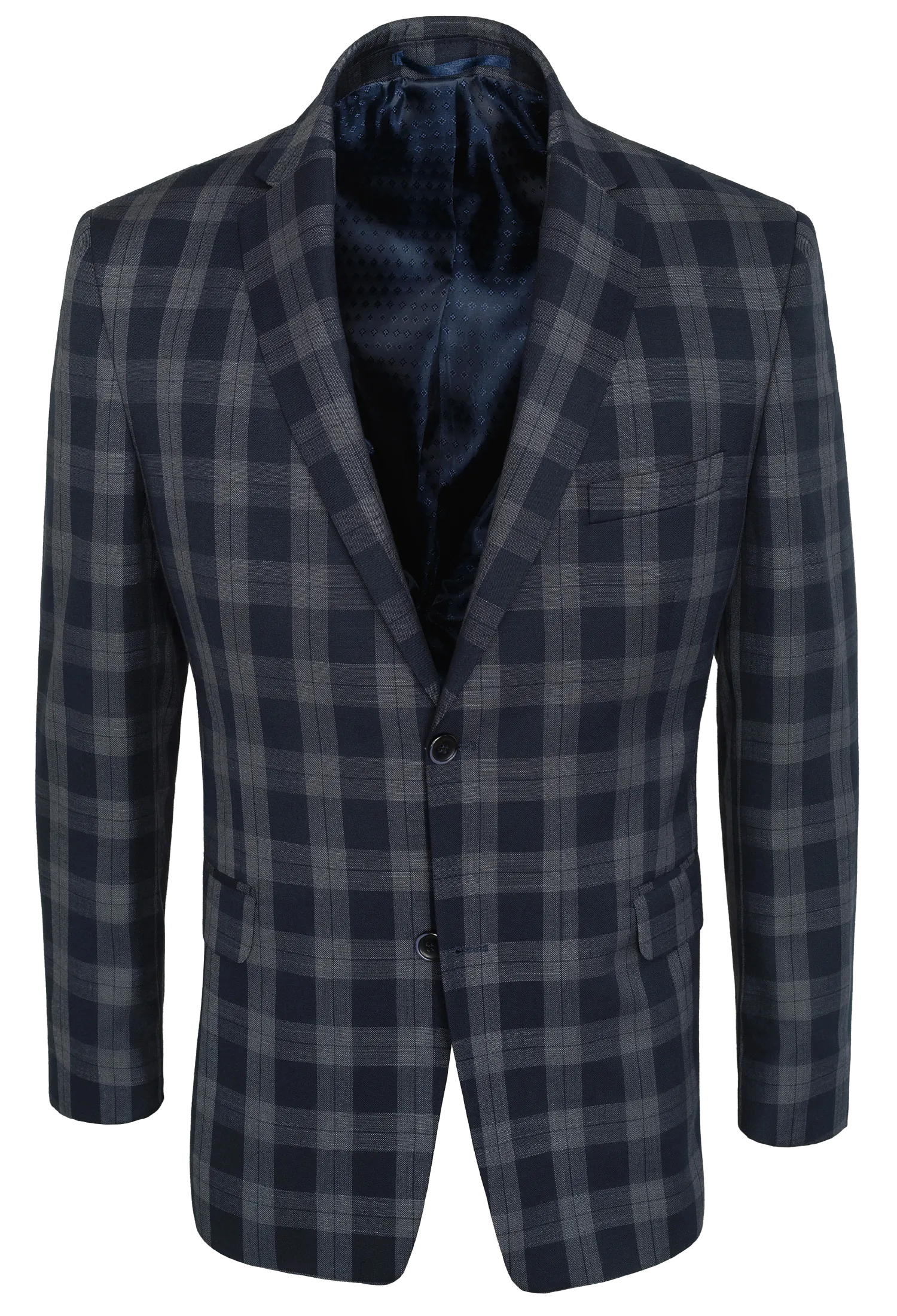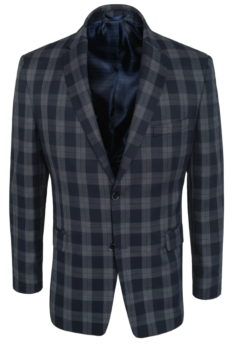 Marynarka w kratę w kolorze granatowo-popielatym. Model lekko dopasowany, marynarka jednorzędowa, proste klapy, dwie kieszenie z patkami plus tradycyjna butonierka, z tyłu dwa rozcięcia. Wyrób utrzymany w stylu Dress Code, świetnie pasuje do wielu stylizacji.