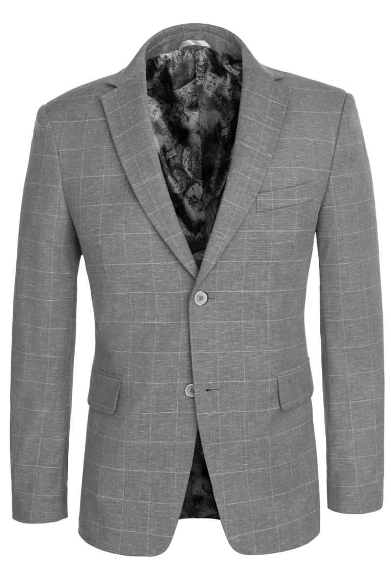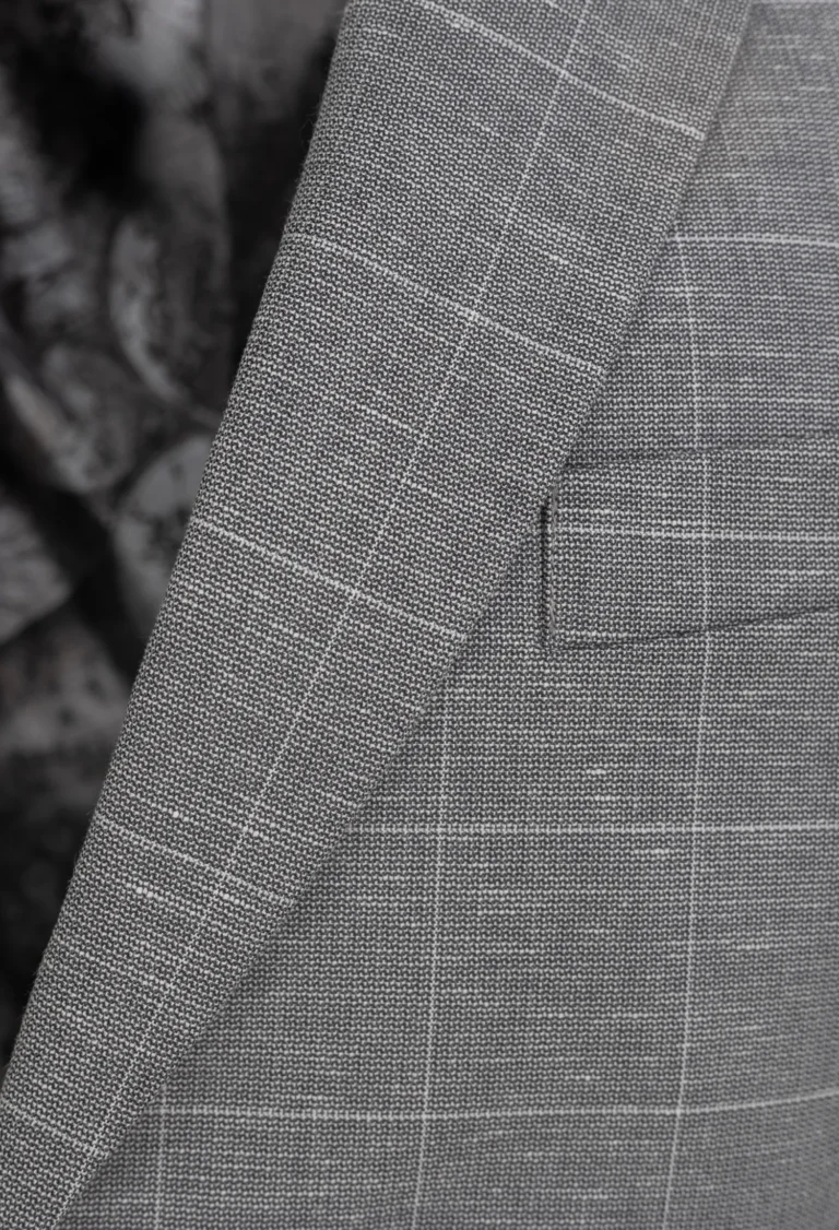 Marynarka letnia jasno-popielata w delikatną kratkę. Ciekawy splot, domieszka lnu oraz delikatny kolor stanowią zalety tej marynarki. Dodatek elastanu zapewnia swobodę ruchu. Idealnie pasuje na letnie dni, do pracy oraz mniej oficjalne spotkania wieczorne.