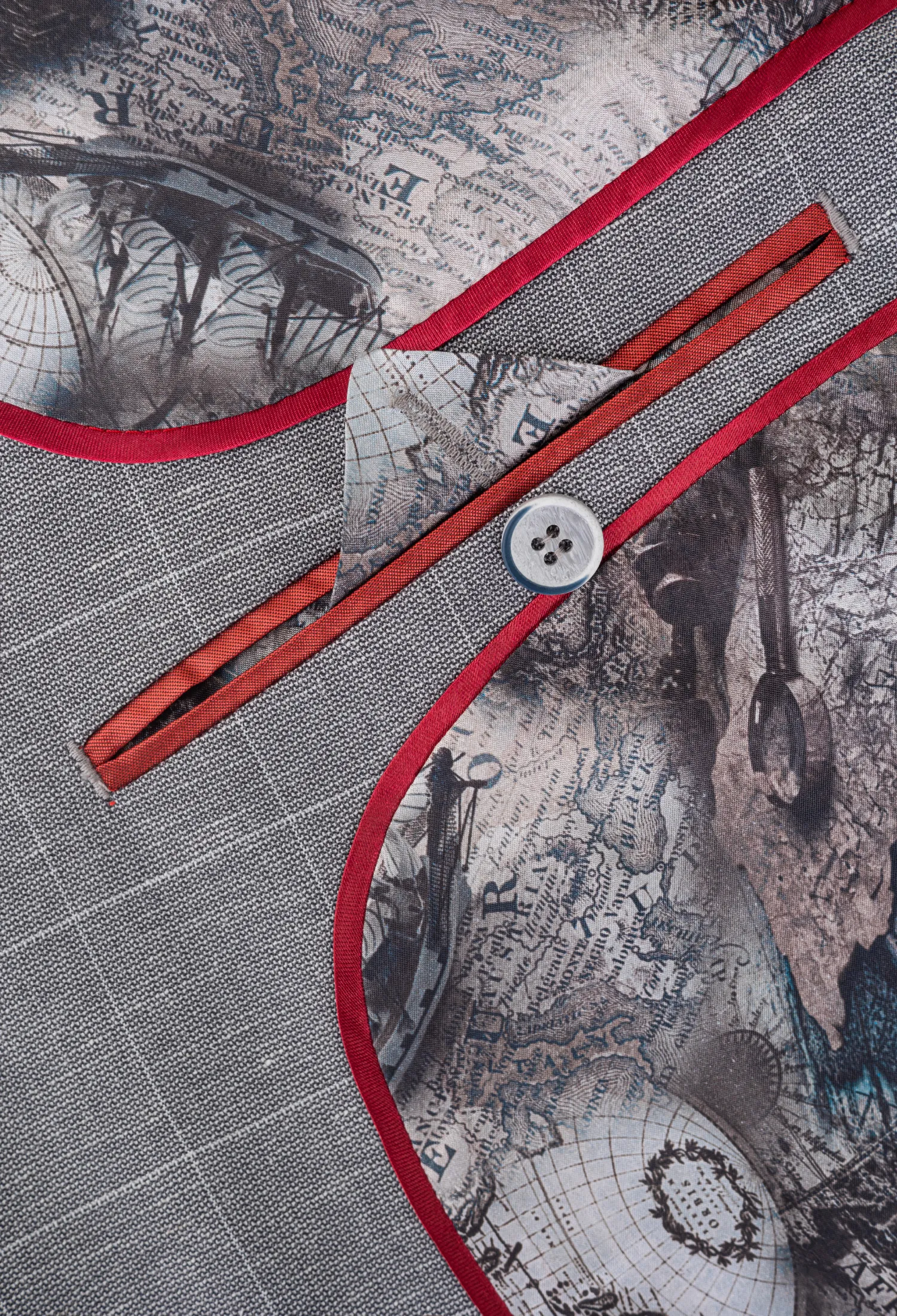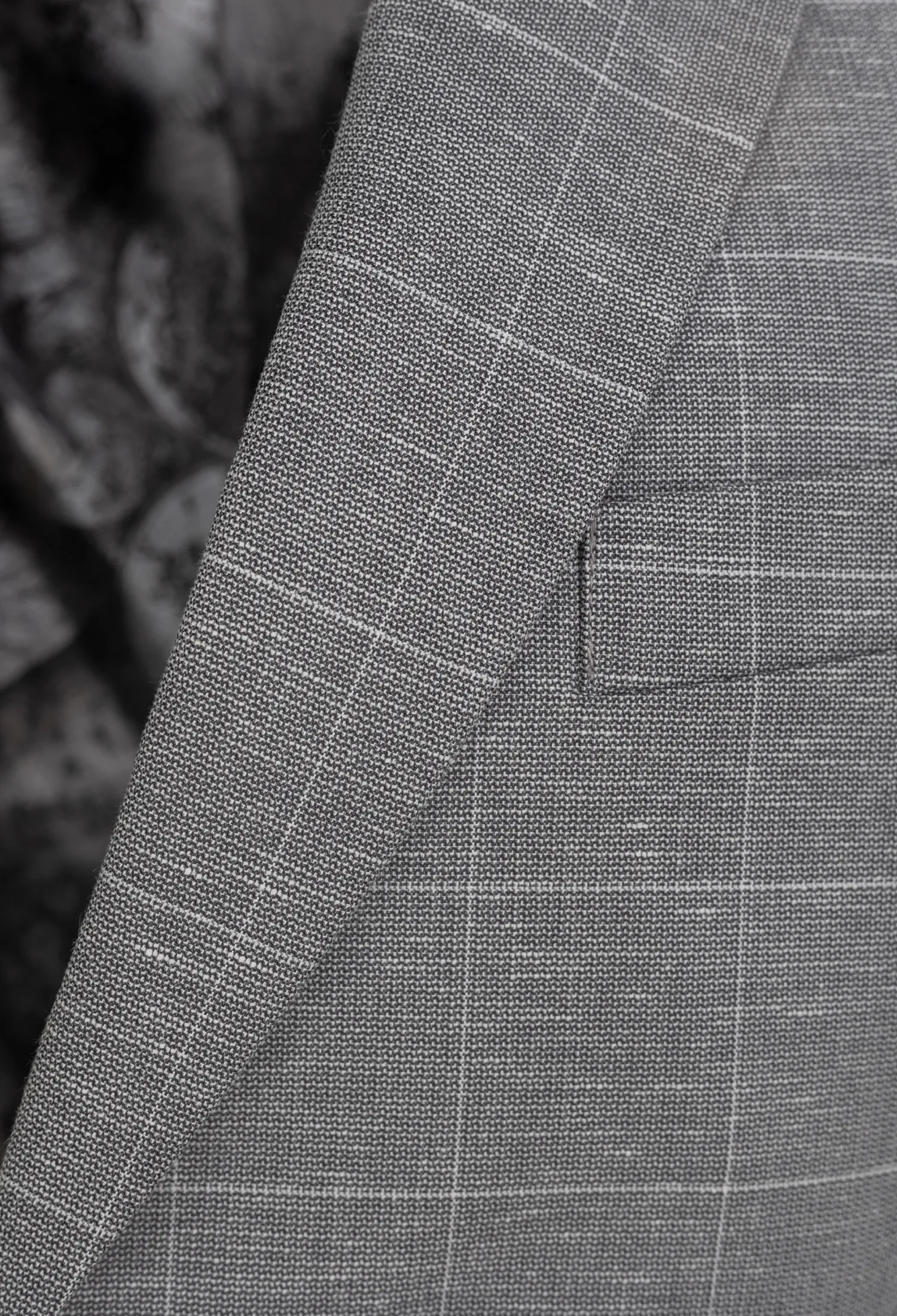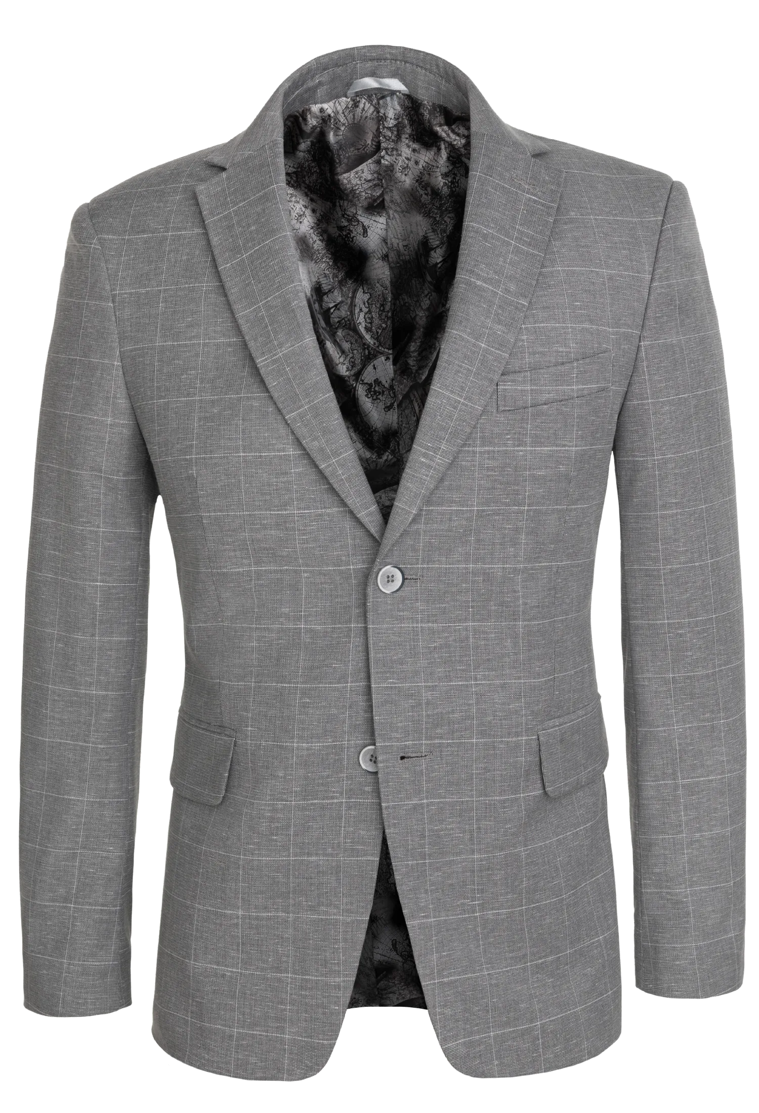 Marynarka letnia jasno-popielata w delikatną kratkę. Ciekawy splot, domieszka lnu oraz delikatny kolor stanowią zalety tej marynarki. Dodatek elastanu zapewnia swobodę ruchu. Idealnie pasuje na letnie dni, do pracy oraz mniej oficjalne spotkania wieczorne.