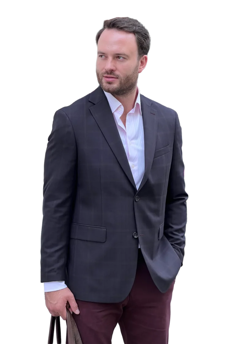 Klasyczna męska marynarka w eleganckim brązowym kolorze z bardzo delikatnym wzorem w kratkę. Wykonana z wysokiej jakości tkaniny z domieszką 30% wełny — zapewnia komfort noszenia, trwałość i nienaganny wygląd przez cały dzień. Elegancka i uniwersalna – pasuje do stylizacji biznesowych i codziennych.