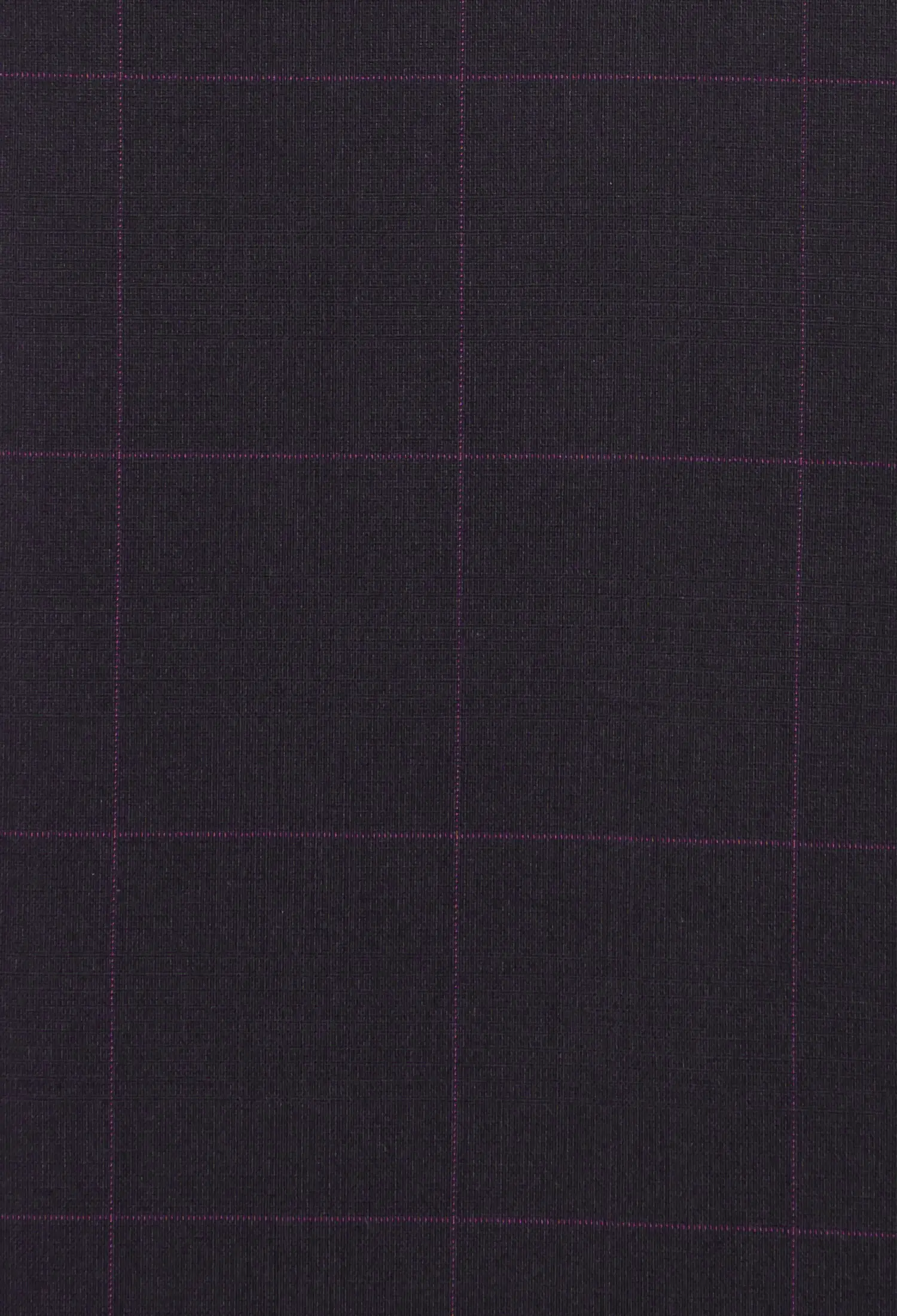Spodnie klasyczne w kolorze brązowym w kratkę z widoczną bordową nitką. Posiadają w przodzie dwie kieszenie skośne z tyłu dwie kieszenie cięte zapinane na guzik, zaprasowane na kant z kolanówką, pasek z gurtem. Konstrukcja jest wyszczuplona z lekko zwężaną nogawką dołem.