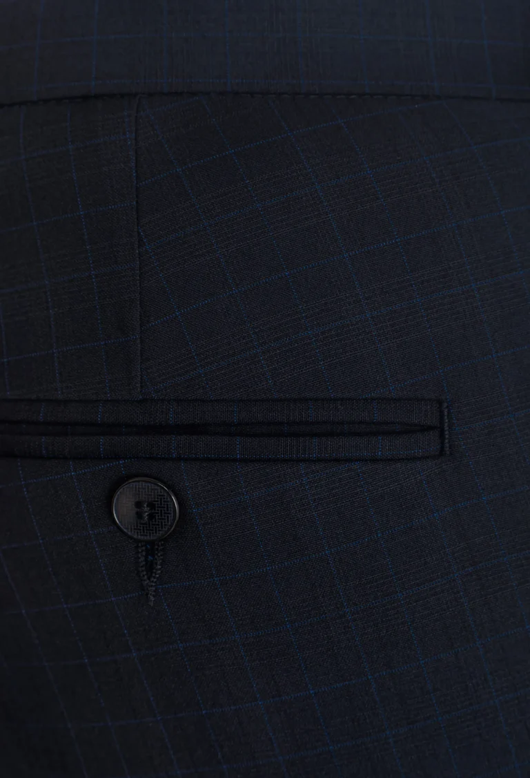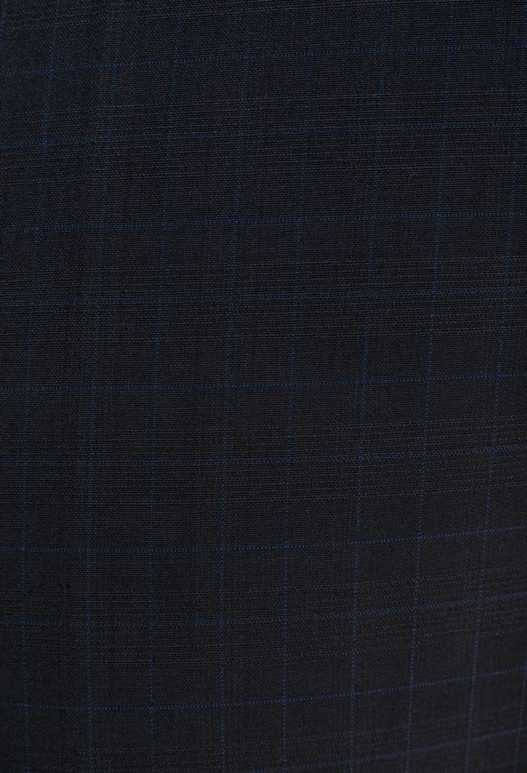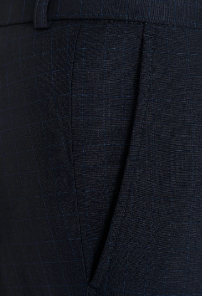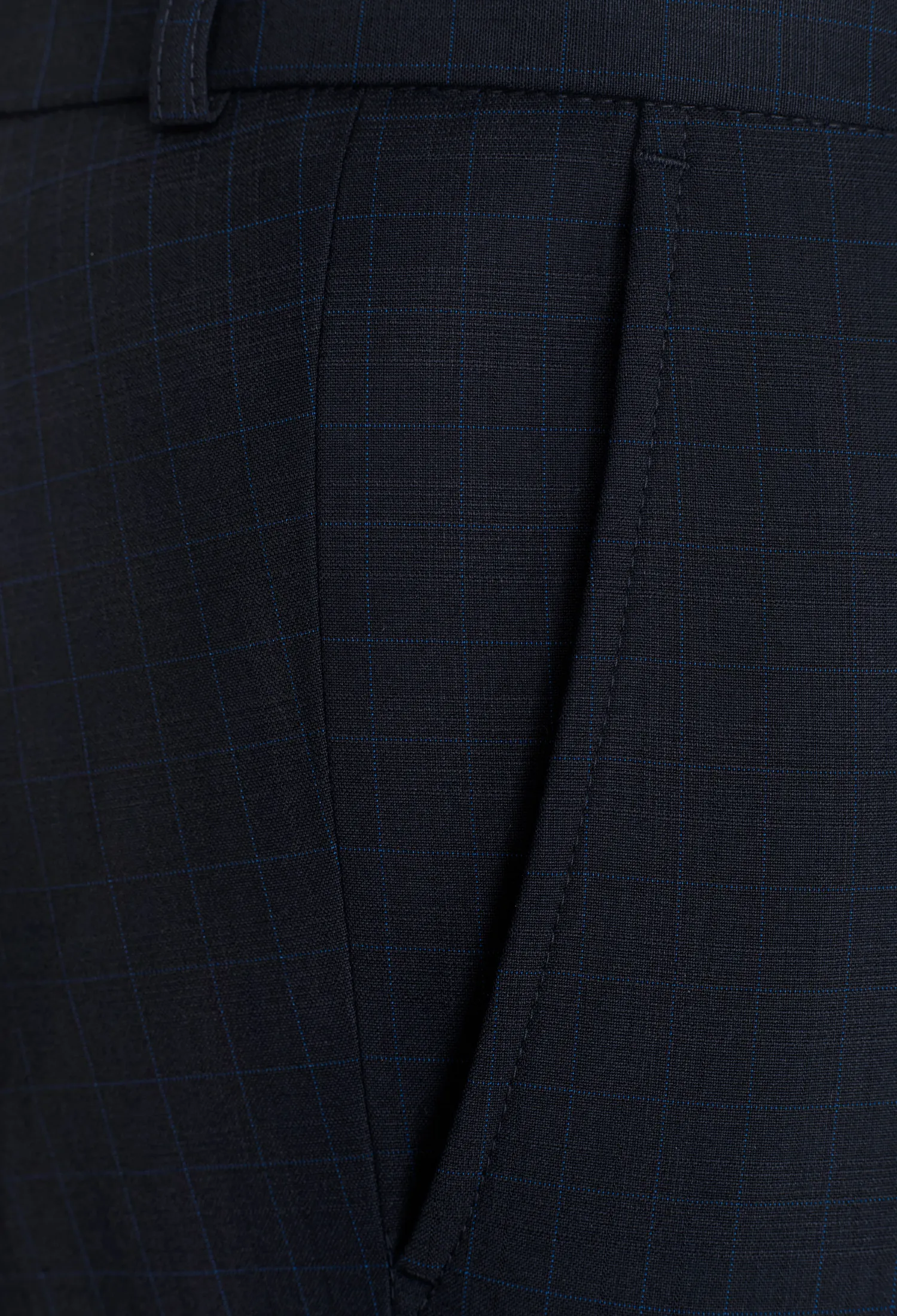Spodnie klasyczne w kolorze ciemnogranatowym w bardzo delikatną kratkę z niebieską nitką. Dodatek elastanu w tkaninie zapewnia swobodny ruch. Spodnie z kolanówką, zaprasowane na kant o wyszczuplonym kroju.