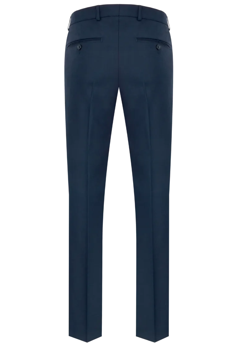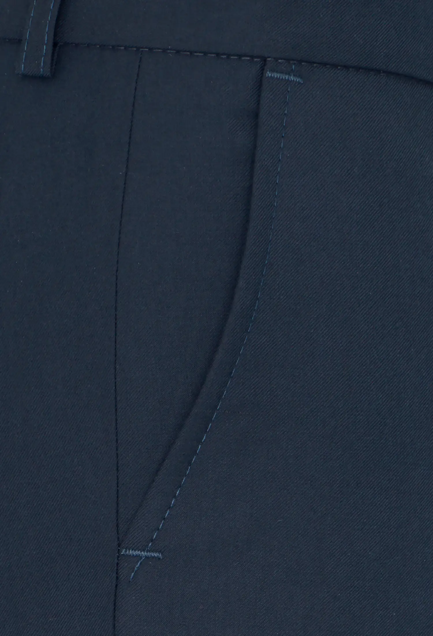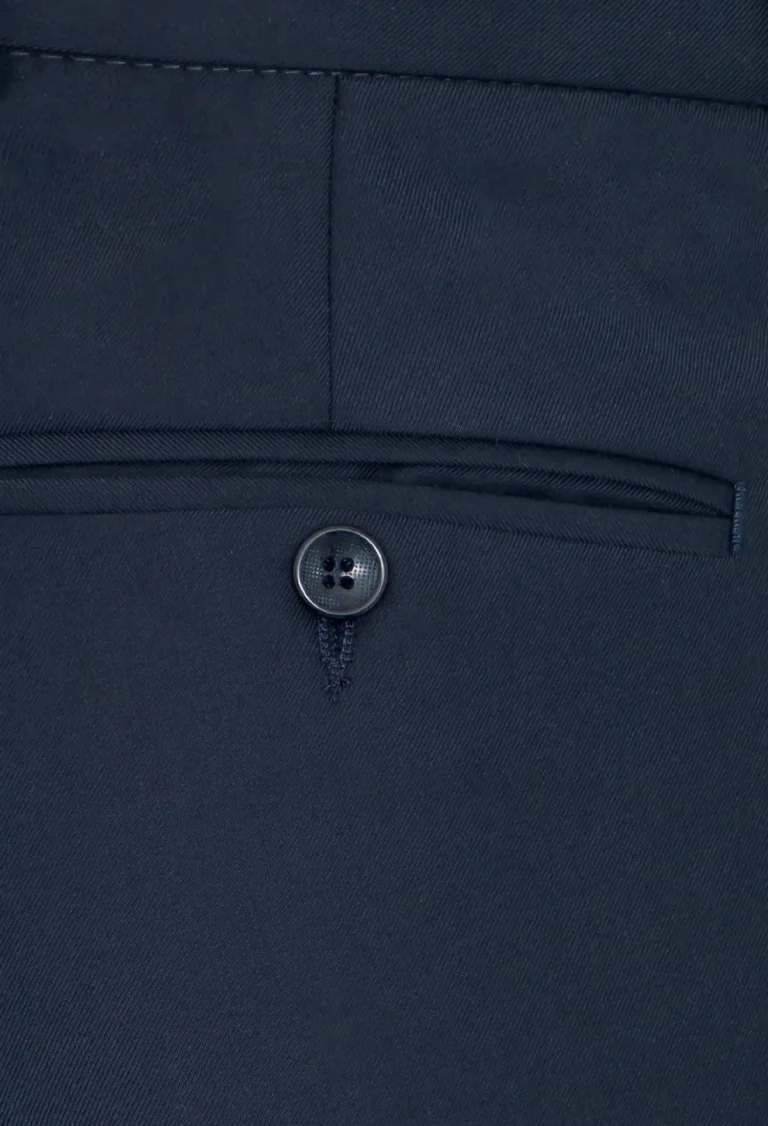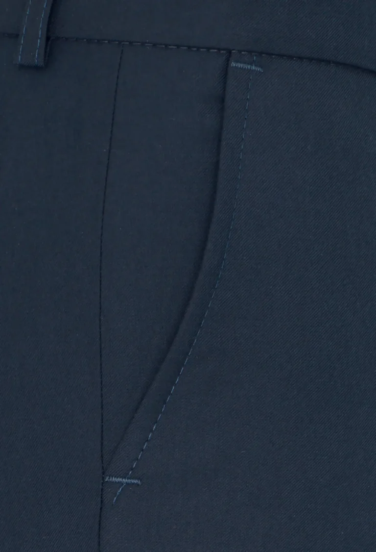 Spodnie klasyczne w kolorze granatowym. Posiadają w przodzie dwie kieszenie skośne z tyłu dwie kieszenie cięte zapinane na guzik, zaprasowane na kant z kolanówką, pasek z gurtem. Konstrukcja jest mocno wyszczuplona z lekko zwężaną nogawką dołem