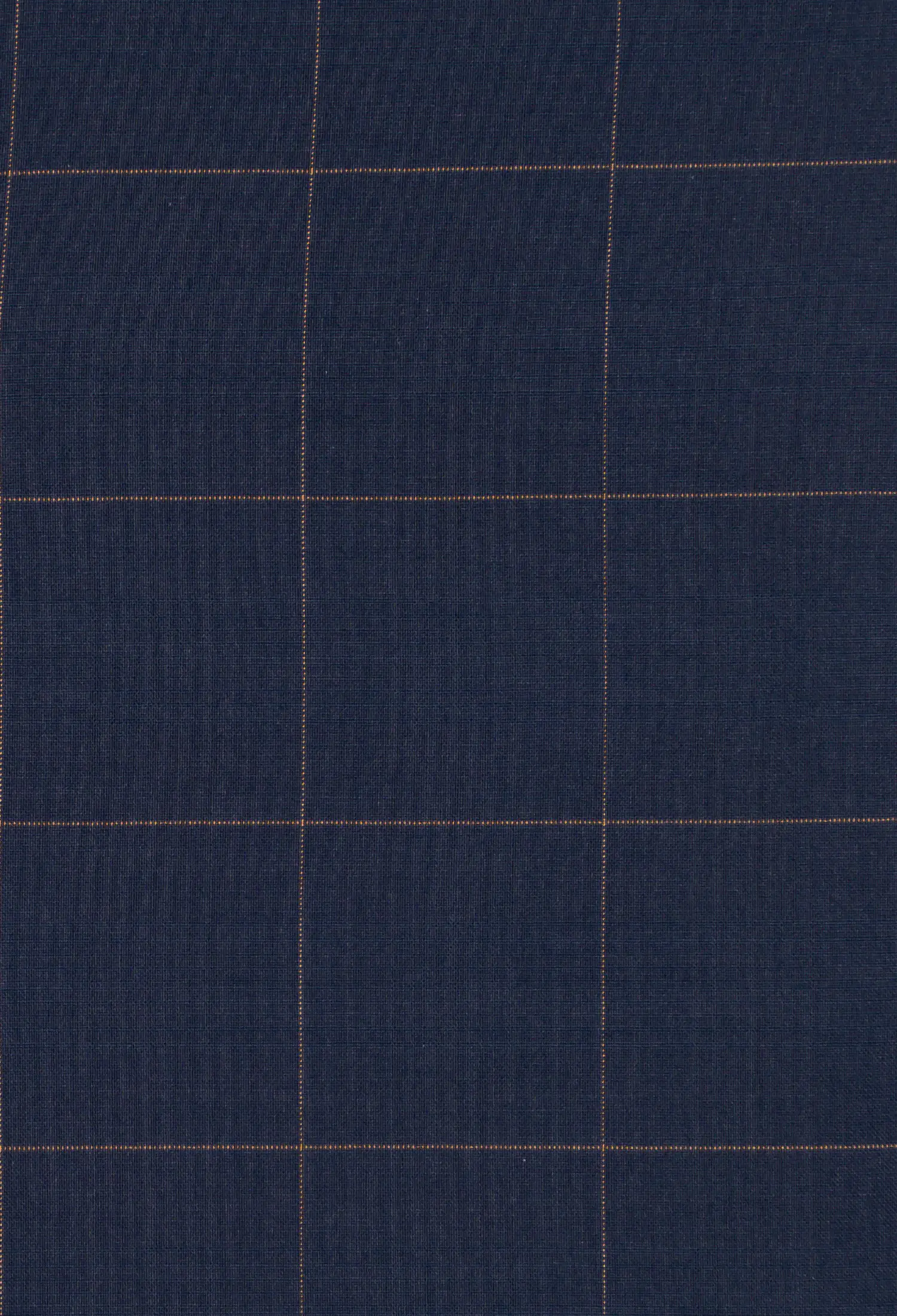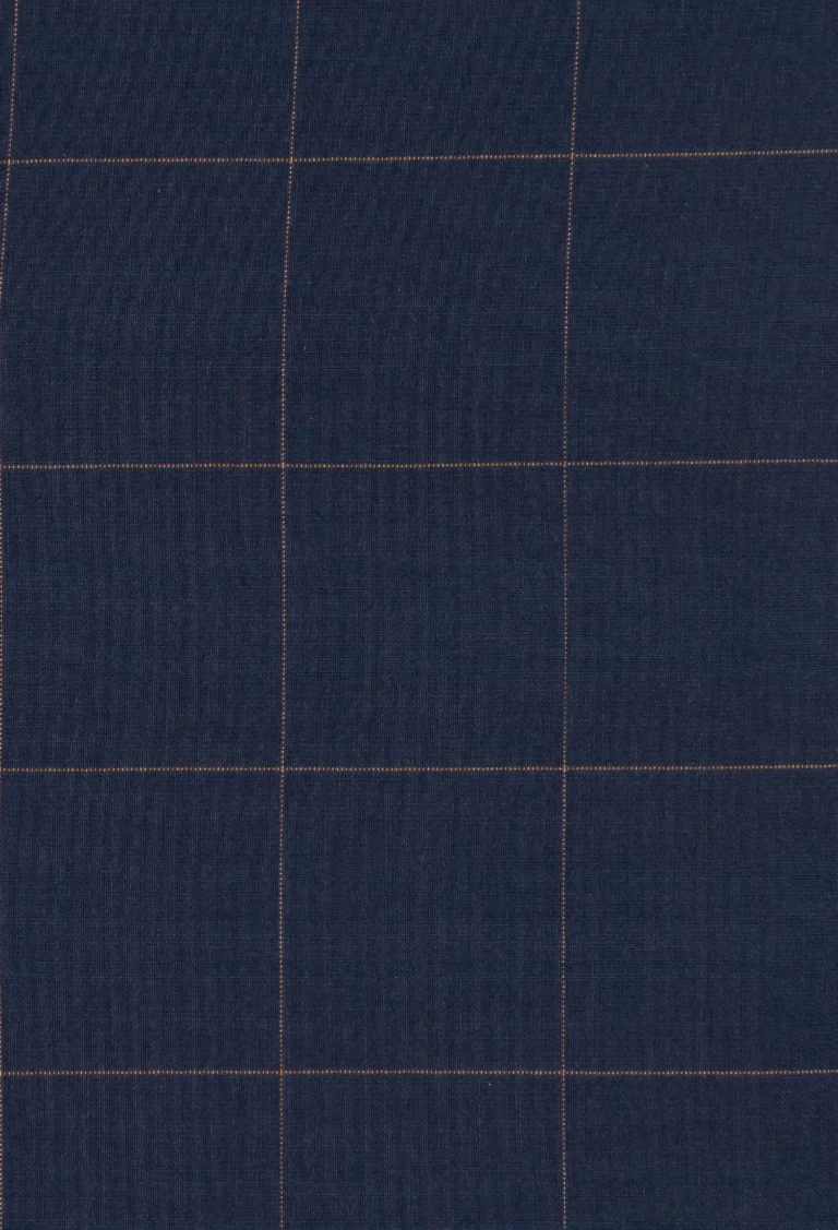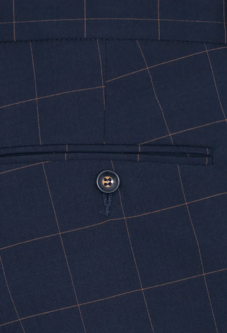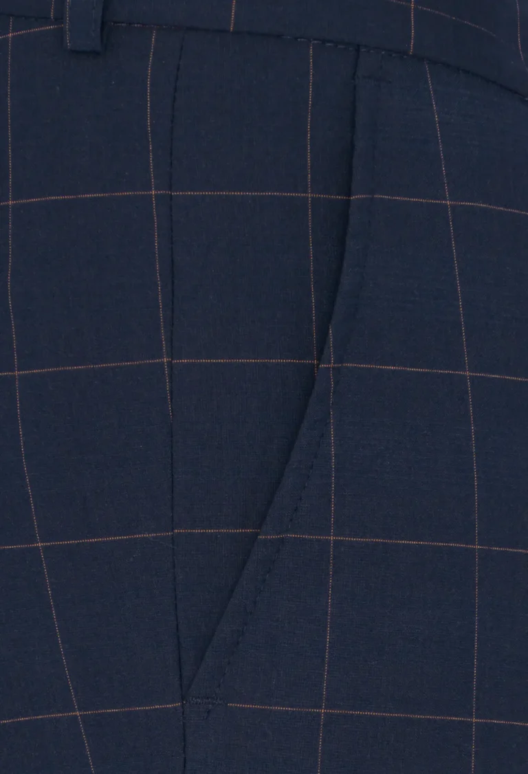 Spodnie klasyczne w kolorze granatowym w kratkę z widoczną camelową nitką. Posiadają w przodzie dwie kieszenie skośne z tyłu dwie kieszenie cięte zapinane na guzik, zaprasowane na kant z kolanówką, pasek z gurtem. Konstrukcja jest wyszczuplona z lekko zwężaną nogawką dołem.