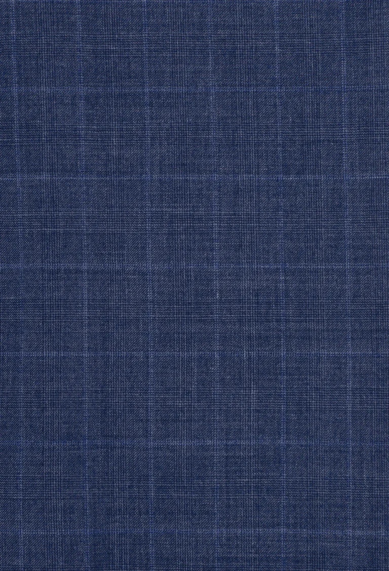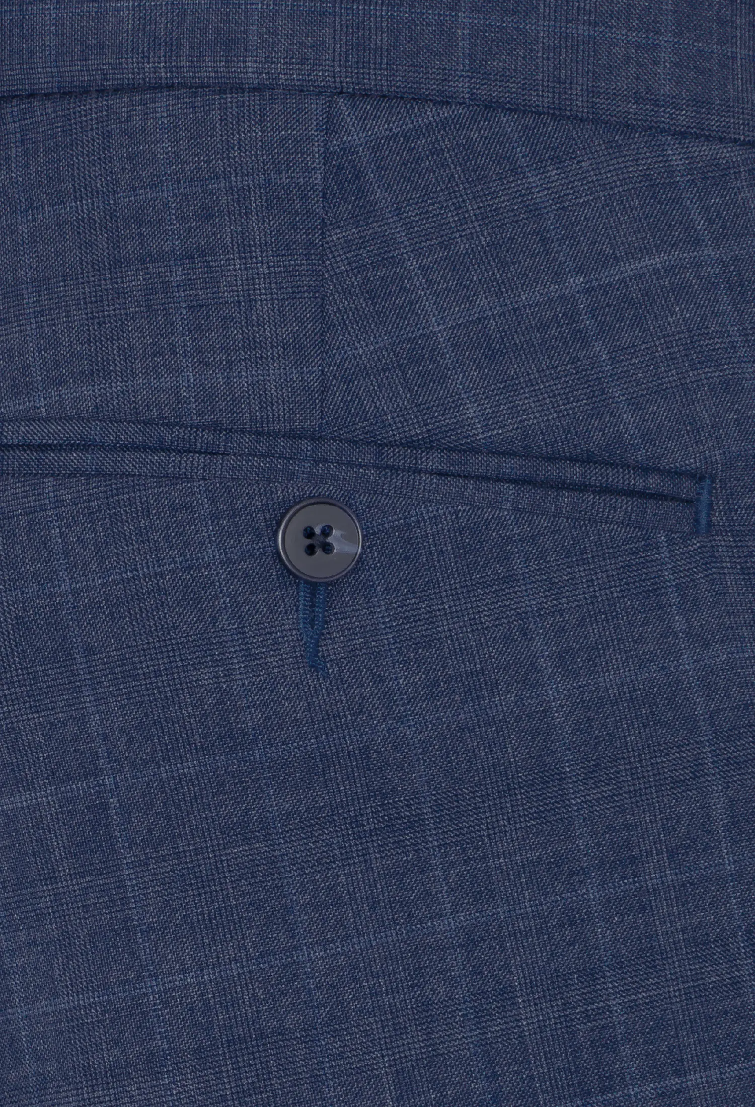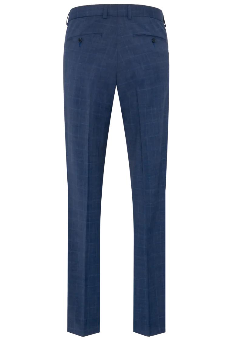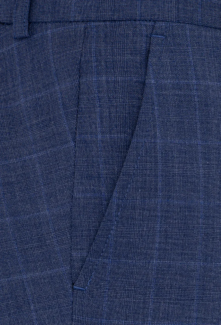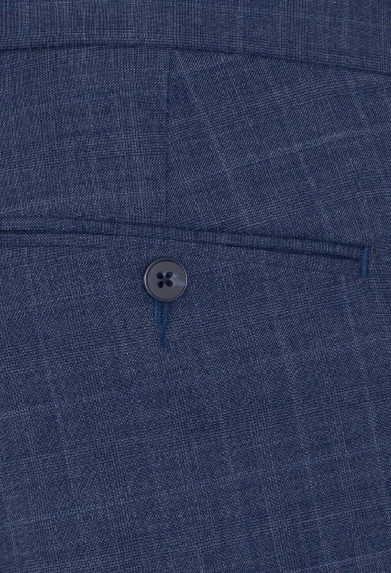 Spodnie klasyczne w kolorze niebieskim w delikatną niebieską kratę. Posiadają w przodzie dwie kieszenie skośne z tyłu dwie kieszenie cięte zapinane na guzik, zaprasowane na kant