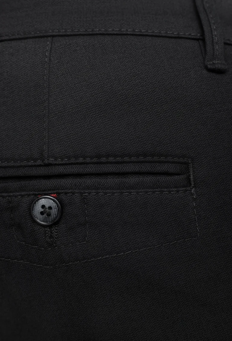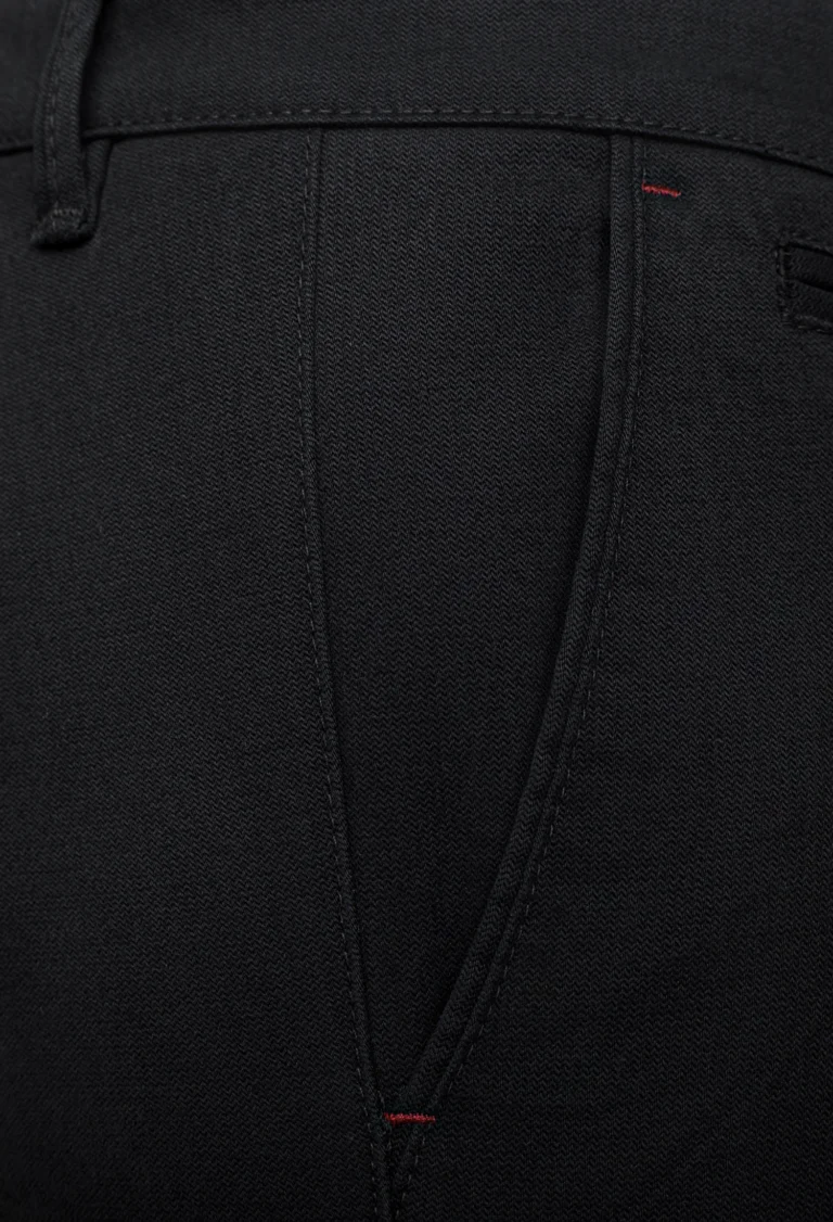 Czarne spodnie jesienno-zimowe typu Chinos, wykonane z grubszej miękkiej bawełnianej tkaniny z delikatną strukturą, z dodatkiem elastanu. Casualowy charakter podkreślają nastebnowane akcenty w postaci kontrastowych rygielków. Idealny wygodny fason do niezobowiązujących stylizacji, pasujące na każdą sylwetkę i okazję.