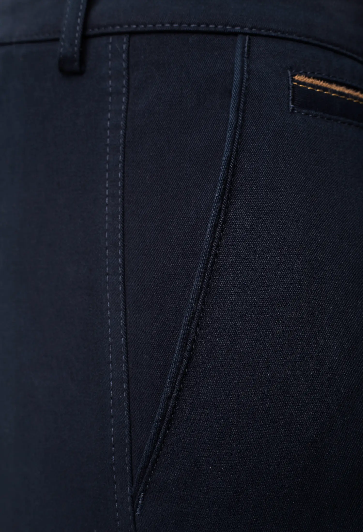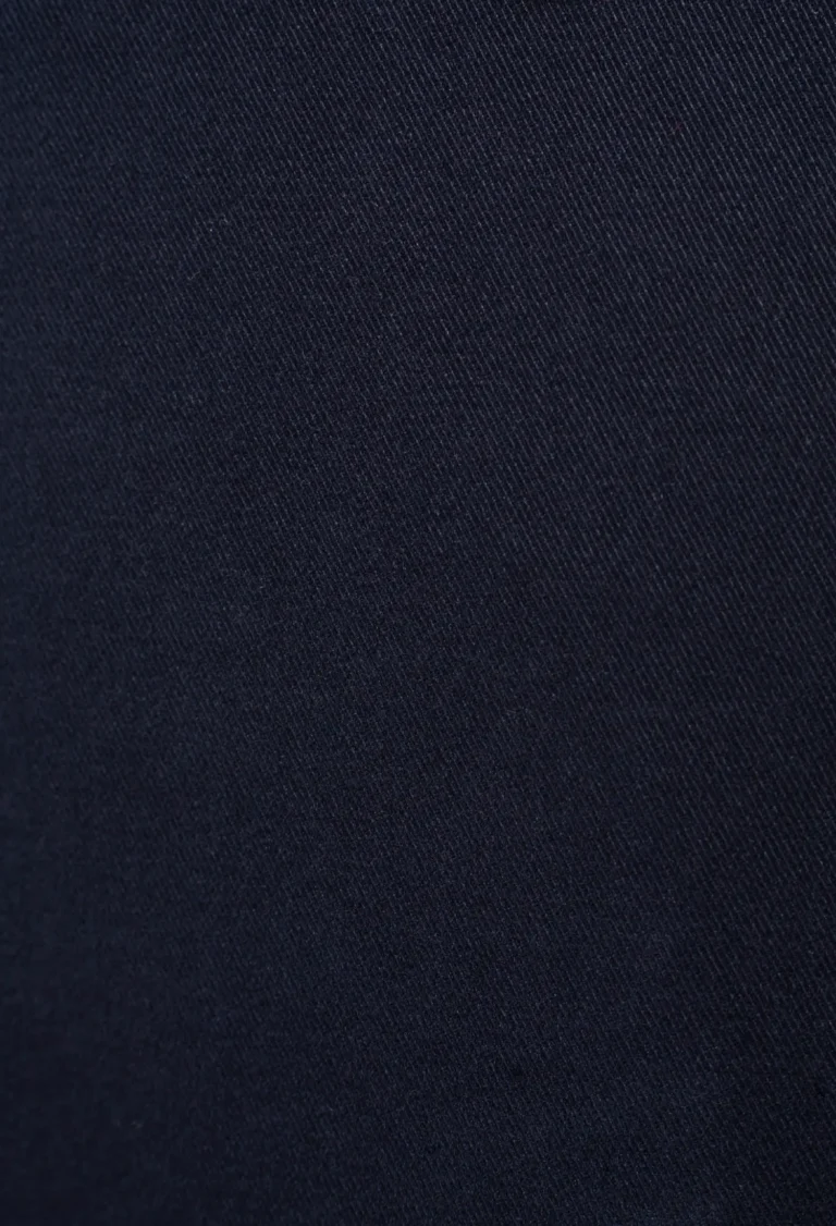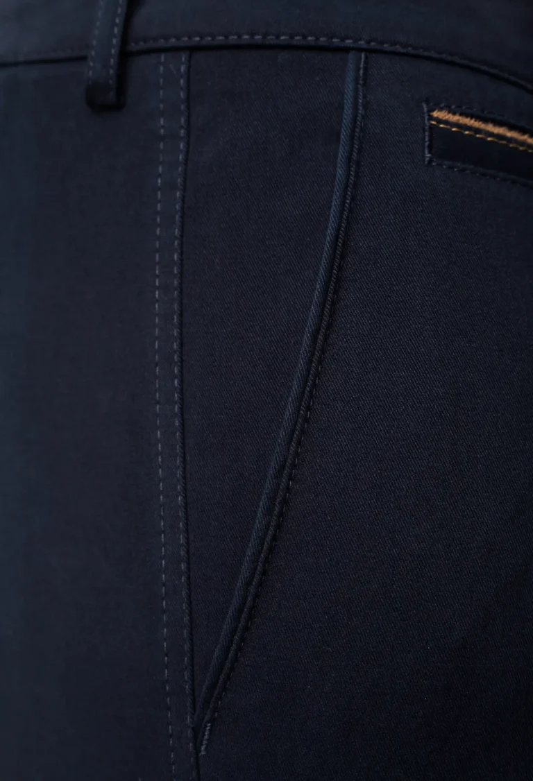 Spodnie męskie w kolorze granatowym, z tkaniny całorocznej, z delikatnym meszkiem, bardzo miłe w dotyku. Dodatek elastanu zapewnia swobodę ruchów i noszenia.