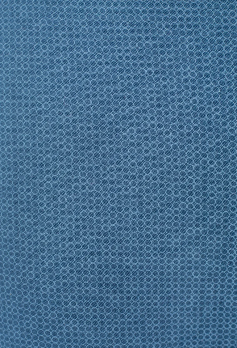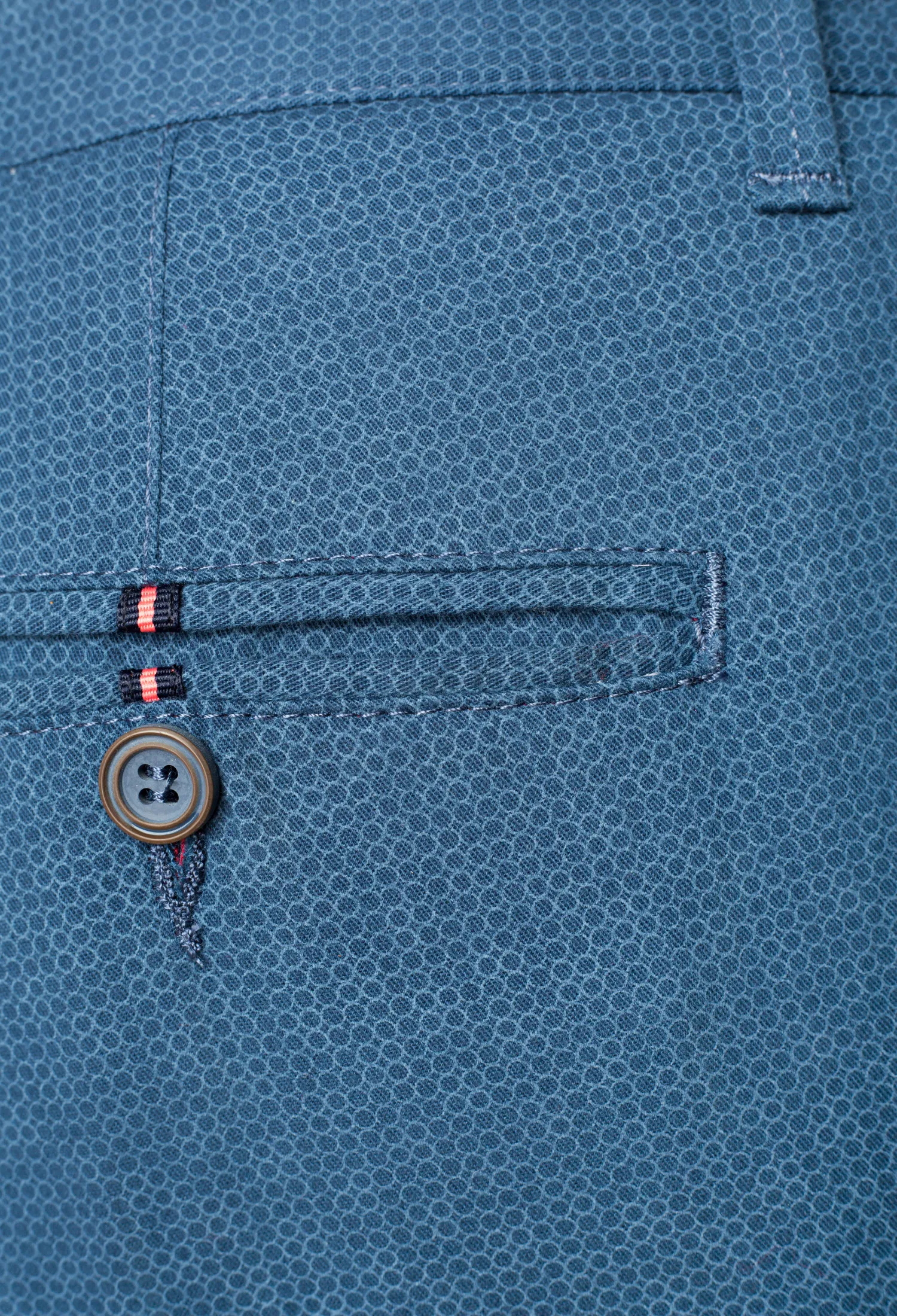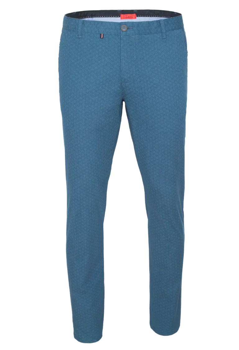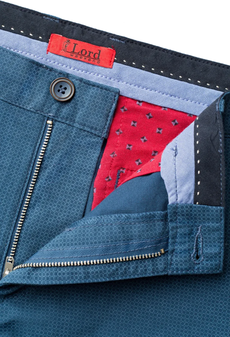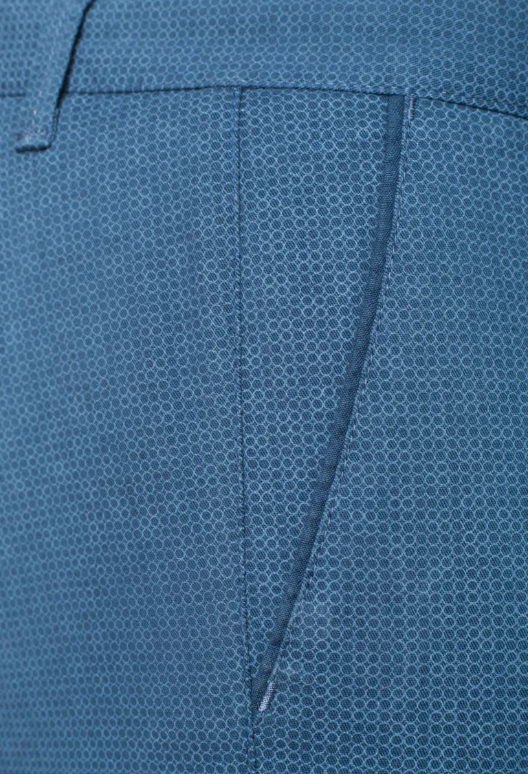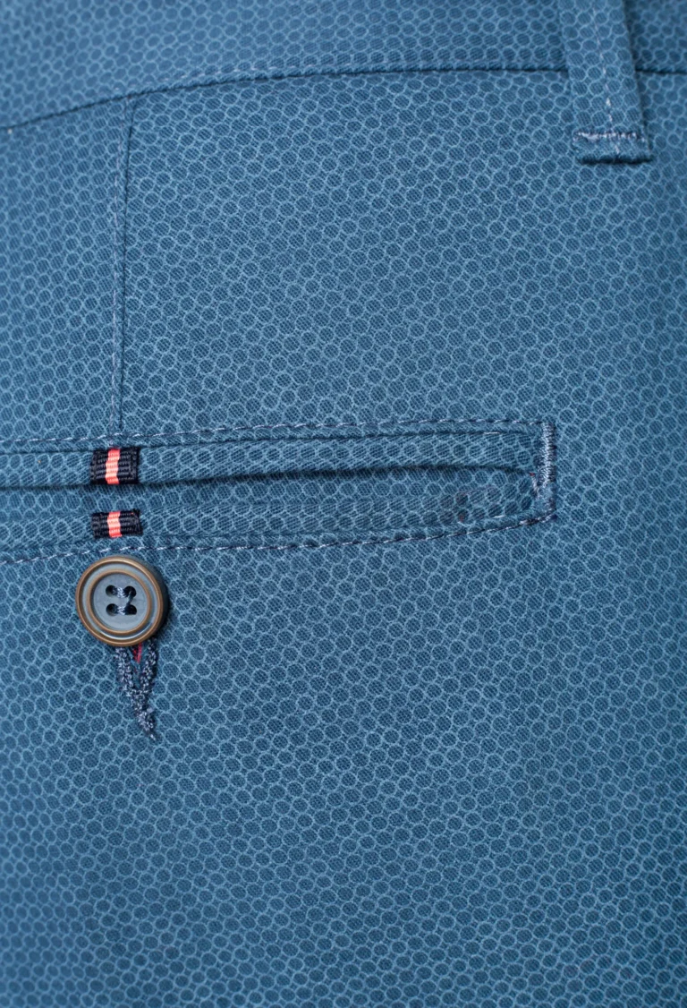 Spodnie męskie typu chinos całoroczne niebieskogranatowe wykonane z drukowanej bawełny z dodatkiem elastanu w delikatny drobny wzór.