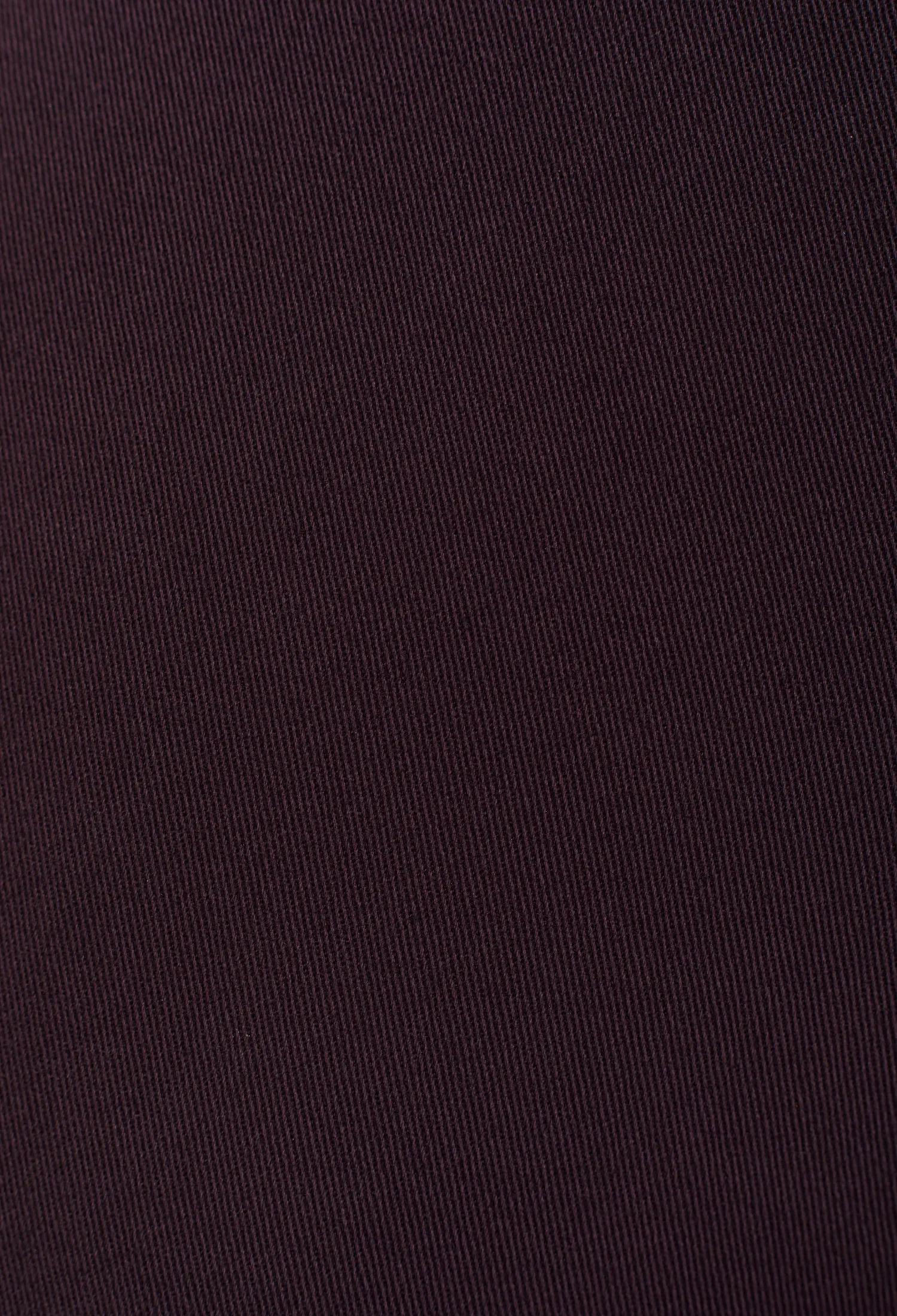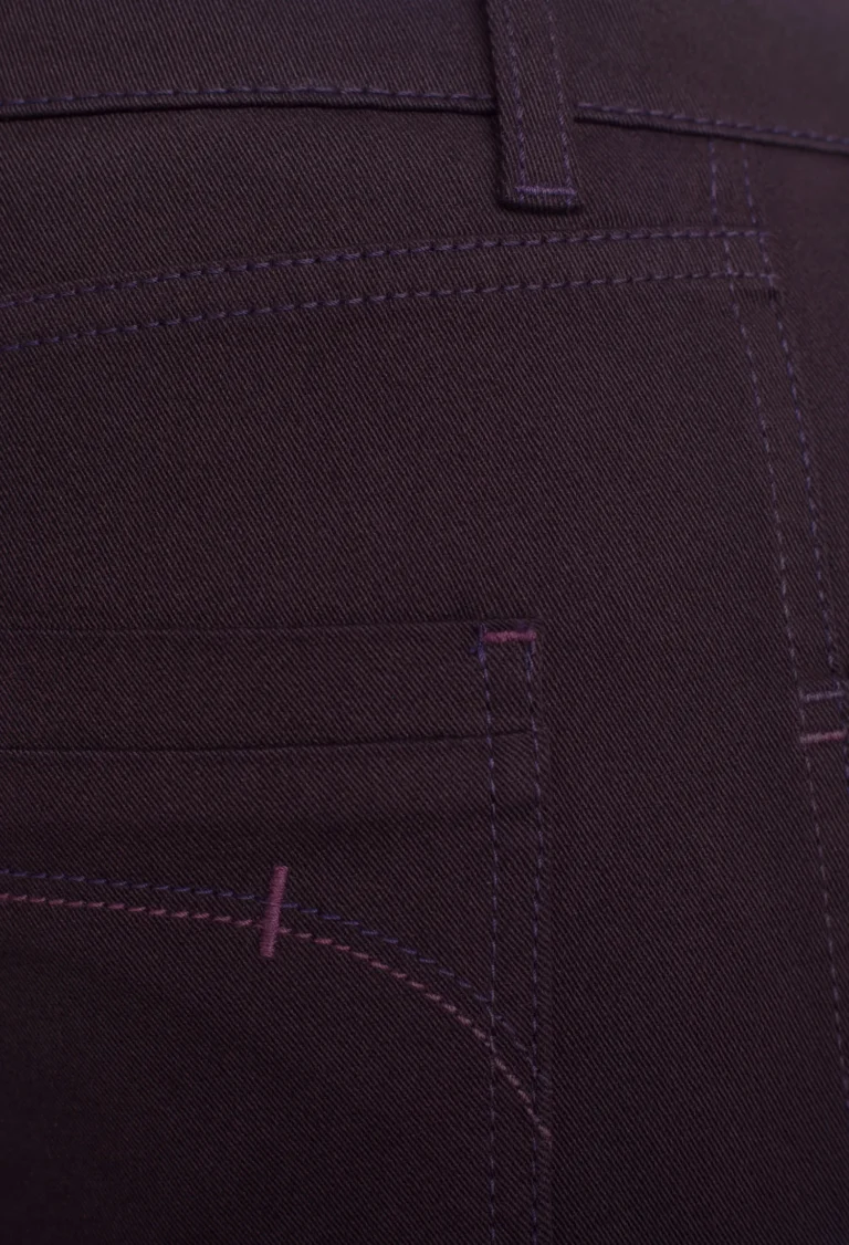 Model jesienno-zimowy wykonany z grubszej bawełnianej tkaniny z dodatkiem elastanu o splocie diagonalnym w kolorze dojrzałej śliwki. Idealny zamiennik dla jeansów. Znakiem charakterystycznym są dwie półokrągłe kieszenie w przodzie z dodatkową kieszonką tzw. zegarówką. Tył spodni z karczkiem z dwoma naszywanymi kieszeniami. Skład tkaniny z dużą przewagą bawełny powoduje, że spodnie są bardzo wygodne, miękkie a dodatek elastanu daje dobre dopasowanie i utrzymanie pożądanego kształtu. Świetnie wyglądają w towarzystwie sportowej marynarki.