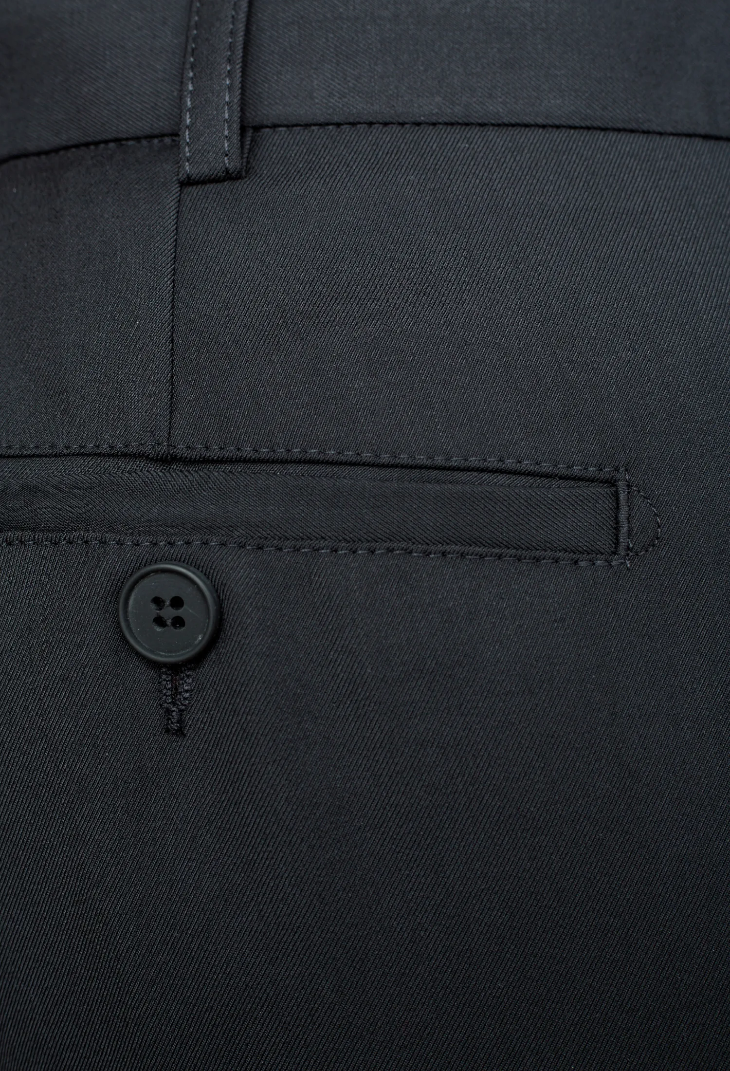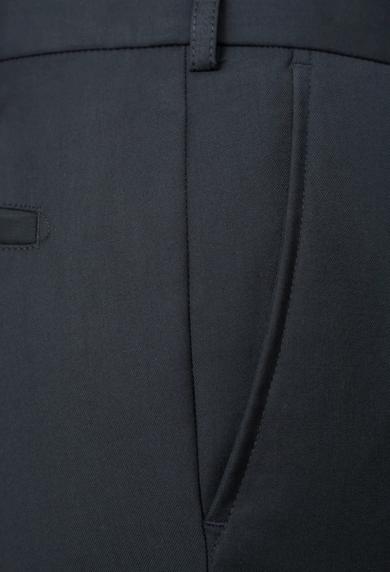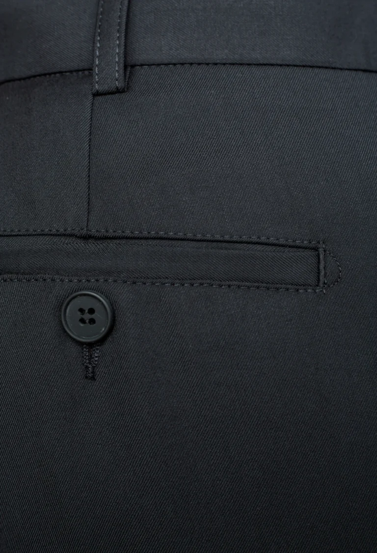 Czarne męskie spodnie klasyczne na kant to podstawa męskiego ubioru. Posiadają w przodzie dwie kieszenie skośne, z tyłu dwie kieszenie cięte zapinane na guzik. Gurt w pasku spodni uniemożliwia wysuwanie się z nich koszuli. Spodnie świetnie układają się na sylwetce. Konstrukcja została dopracowana w najmniejszych szczegółach, jest wyszczuplona z lekko zwężaną nogawką dołem. Model świetnie się spisze zarówno na biznesowych jak i na mniej formalnych spotkaniach. Pasują zarówno do marynarki wizytowej jak i casualowej, solo można je nosić z koszulkami.